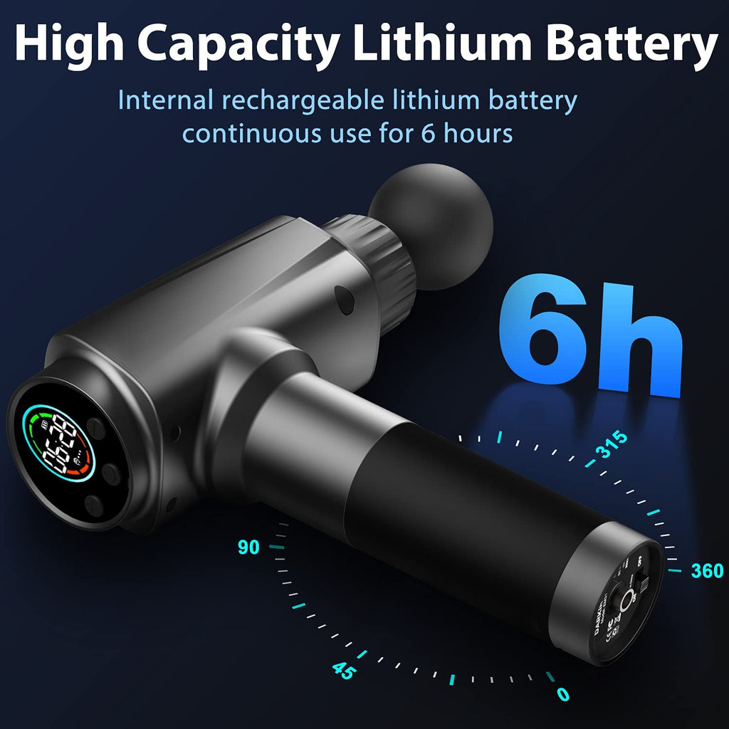 LONG BATTERY LIFE: The Deep Tissue Massage Gun Equipped with 2500mAh high-quality rechargeable lithium battery, can be continuously run for up to 6 hours.